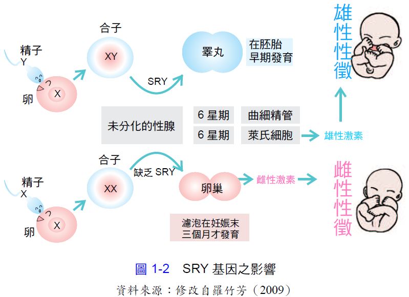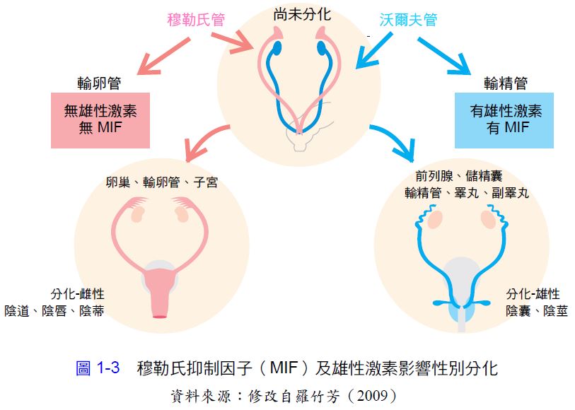 胚胎發育到第六週後,Y 染色體上的 SRY 基因開始協調睪丸建構的過程(如圖 1-2 所示),到第二個月與第三個月之間,雄性胚胎在穆勒氏抑制因子(Mûllerian inhibiting factor, MIF)與雄性激素〔即睾固酮(testosterone)〕等影響因子的作用下,沃爾夫氏管會分化為副睪丸、輸精管及儲精囊,穆勒氏管則會退化。然而,女性的胚胎則因沒有穆勒氏抑制因子及雄性激素,因此穆勒氏管會分化為輸卵管、子宮和陰道上部,而沃爾夫氏管則會退化(如圖 1-3 所示)(陳雅茜譯,2004)。