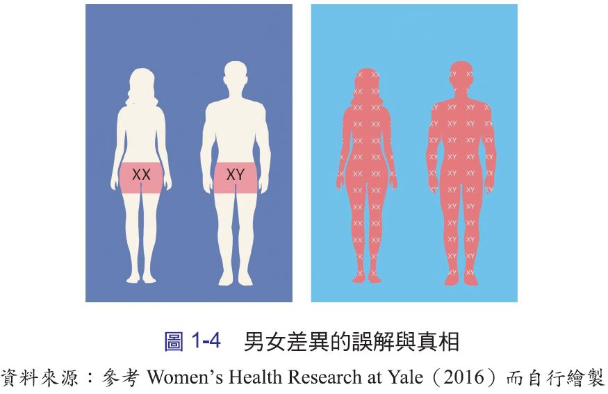 以前一般人認為,男女的差異就只是如圖1-4左邊的圖,僅有部分器官上的差異,但其實真正的差異卻是像圖 1-4 右邊的圖,男生的全身都是 XY 細胞,女生則全身都是 XX 細胞(Women’s Health Research at Yale, 2016)。
