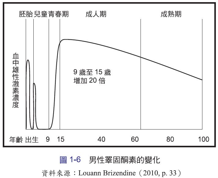 因為男女大腦之結構不一樣,腦下垂體控制激素分泌的模式也不同,因此男女體內的激素分泌發展模式也有所差異。男性的雄性激素分泌是較穩定的,雖然兒童期和青春期的睪酮素變化相差二十倍,青春期睪固酮素整個上升,之後會慢慢地衰減,但基本上是較為穩定的狀態(如圖 1-6 所示)。女性的雌性激素分泌則是起伏較大,每個月都有一個週期(如圖 1-7 所示)。